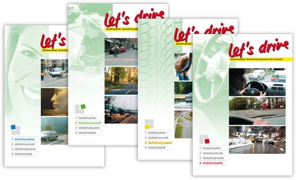 Let's drive fournit les bases des cours pour les usagers de la route et est composé de quatre livrets. Chaque livret aborde un chapitre en détails. Dans les boites pratiques, les quatre thèmes destinés aux élèves sont facilement compréhensibles.